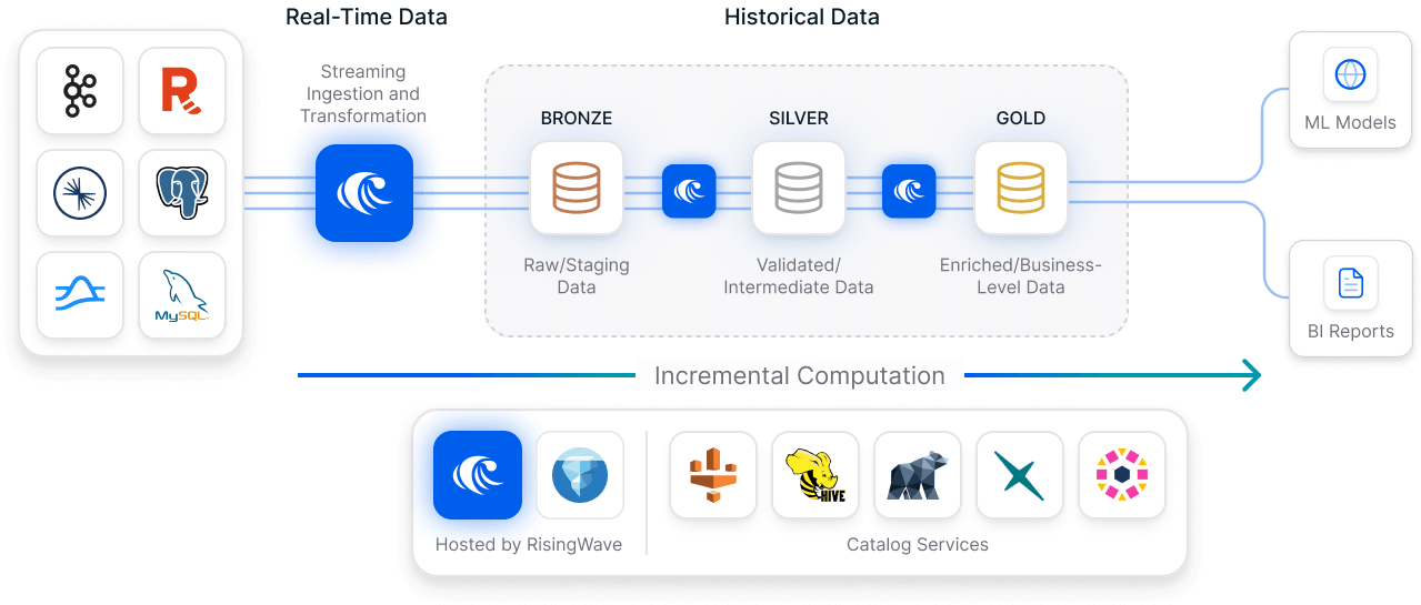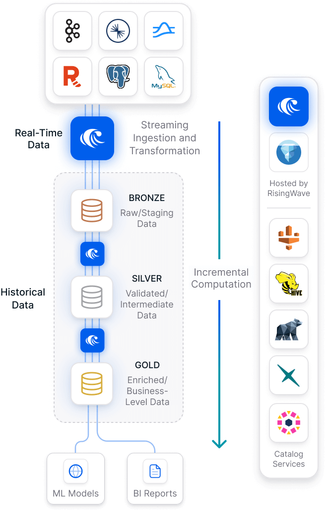 Interoperability is a core design principle of RisingWave. As Iceberg and Delta increasingly become the de facto standards for data lakehouse table formats, RisingWave provides robust read and write support for both.